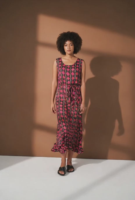Vedevast viskoosist satiinist maksikleit graafilise mustriga.