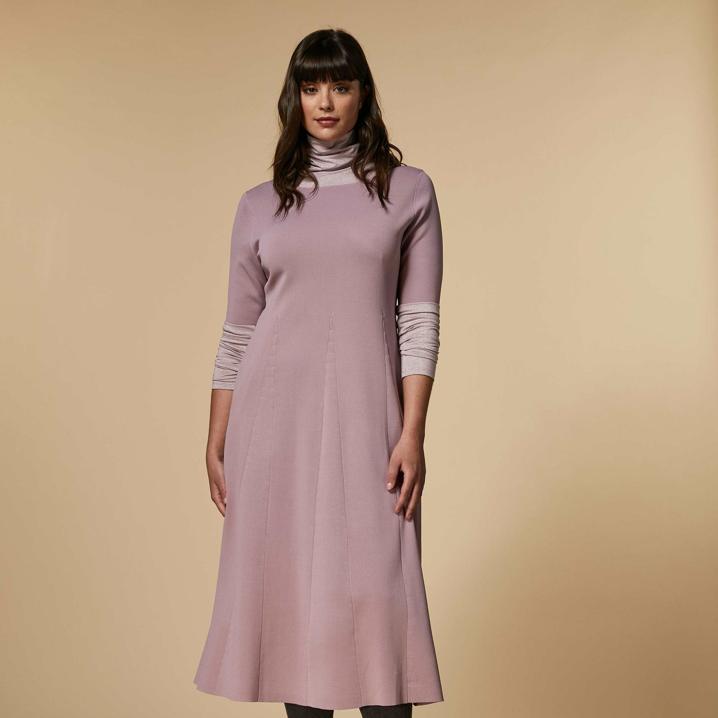 Dress made of stretchy viscose Milano stitch knit, with a segmented intarsia wedge construction to create a striking effect. Wide neckline, long sleeves, and a flared silhouette. Intricate detailing that creates a versatile feminine line.