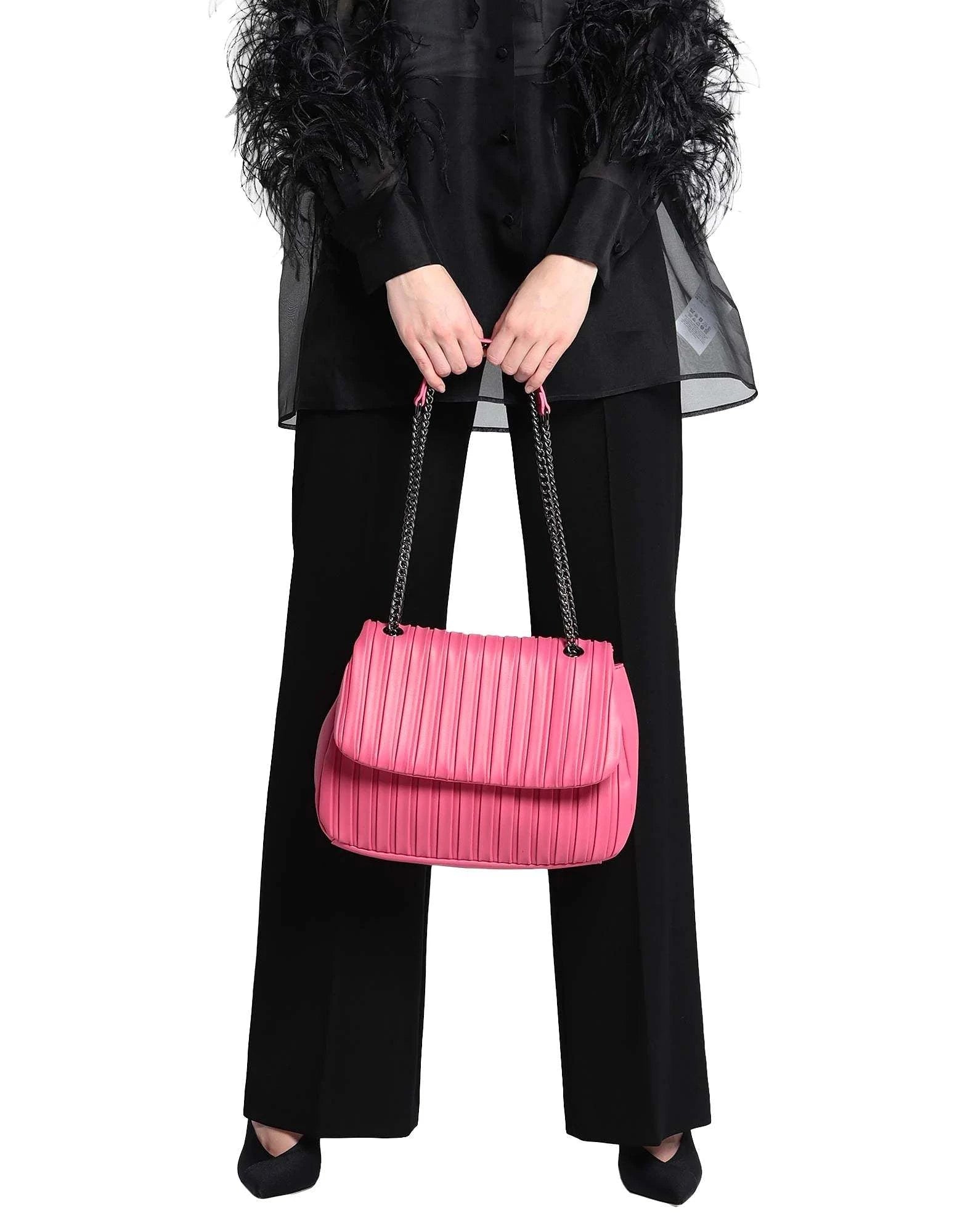 This elegant shoulder bag by Caractère is crafted from soft faux leather with delicate pleated detailing. Featuring a sleek flap with a magnetic closure, a long metal chain strap, and an internal pocket, it perfectly balances modern chic and practicality. Ideal for both day and evening looks.