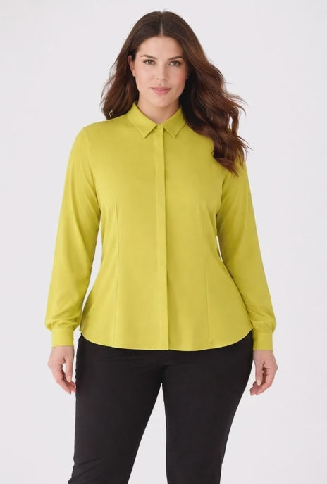 Эта блузка с классическим воротником и потайной застежкой на пуговицы создает элегантный и изысканный образ. Длинные рукава с манжетами подчеркивают ее изящество, а приталенный крой деликатно выделяет фигуру.